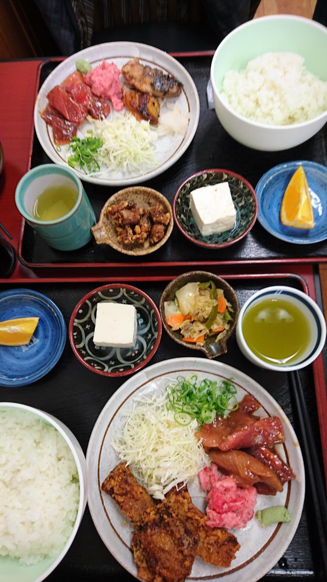下(手前)がカリタチョイス、ネギトロとづけ、マグロの竜田揚げの定食。