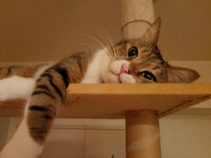 暴れすぎて疲れて、タワーのてっぺんで放心状態のサクちゃん。