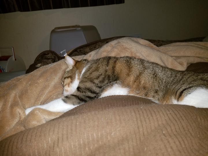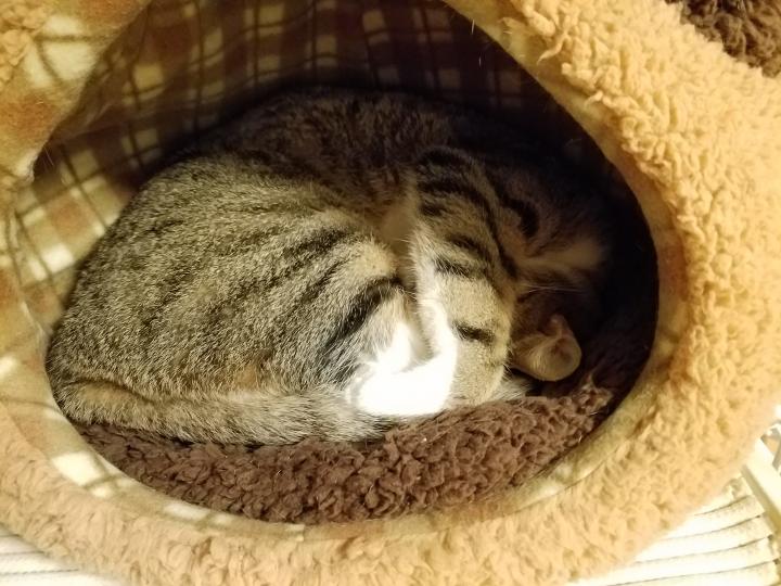 毎晩のように、ゴハンのあとは猫ベッドでウトウトするサクちゃん。