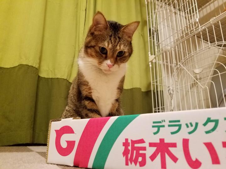 なぜかイチゴの箱を見つめるサクちゃん。