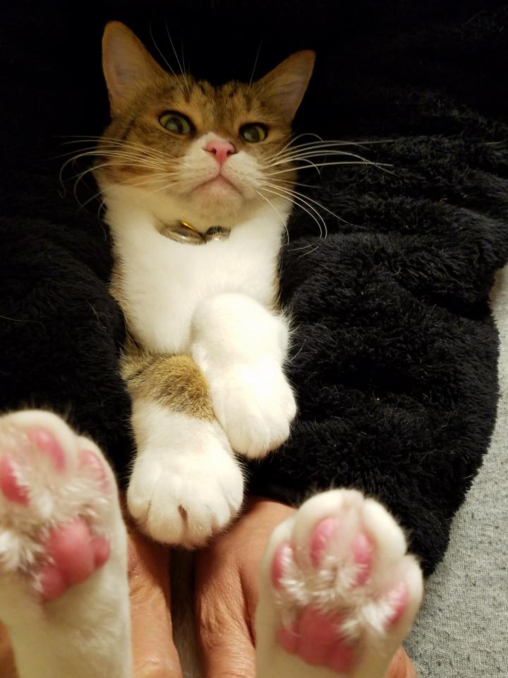 カリタのお腹のうえでフミフミするサクちゃん。