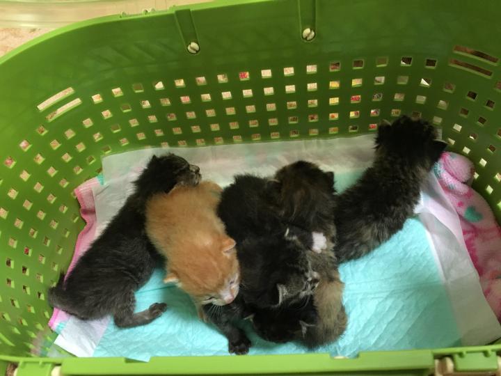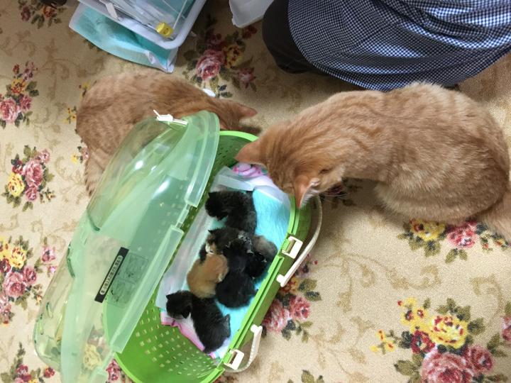 (『なんだなんだ!?』と覗き込んでいる2匹は、ママと一緒に保護した兄弟。子猫達のお兄ちゃんですね)