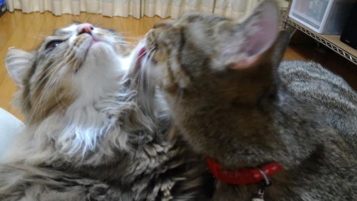 うちの猫ちゃん、まさにグルーミング中♪ お姫様なサッシー&マメなお兄ちゃんリオ(笑)。