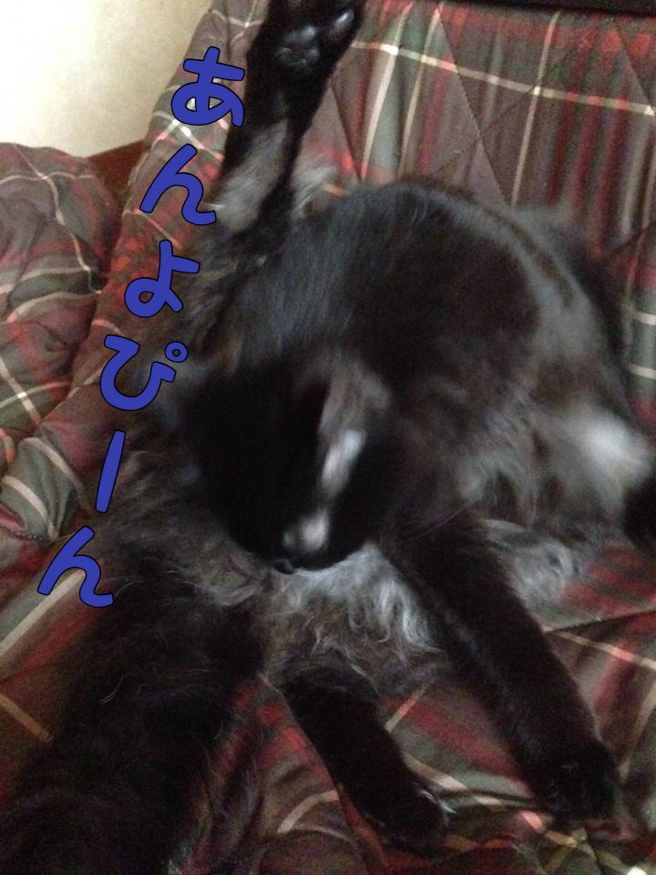 コタツに入れてるねこバカ主の脚の上でくつろぎ、毛繕いをして最終段階のあんよぴーん