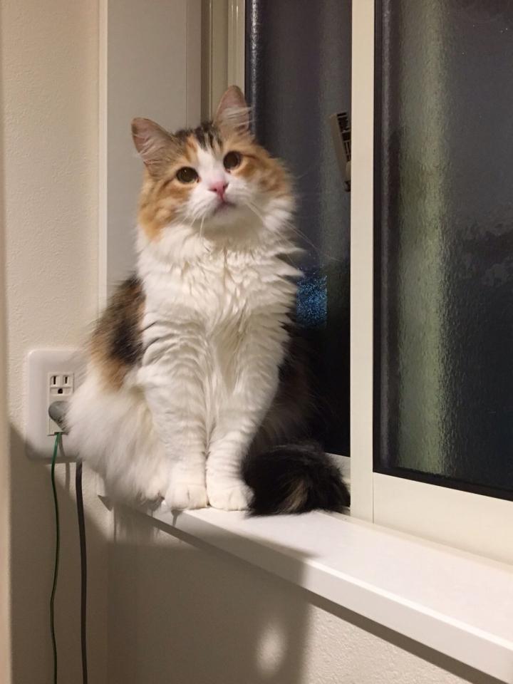 以前は、窓辺から出掛ける自分を見送っていましたが、最近はその場所も多様になり、ソファーや、階段、流しの上と色んな場所から見送ってくれます。