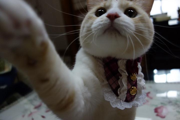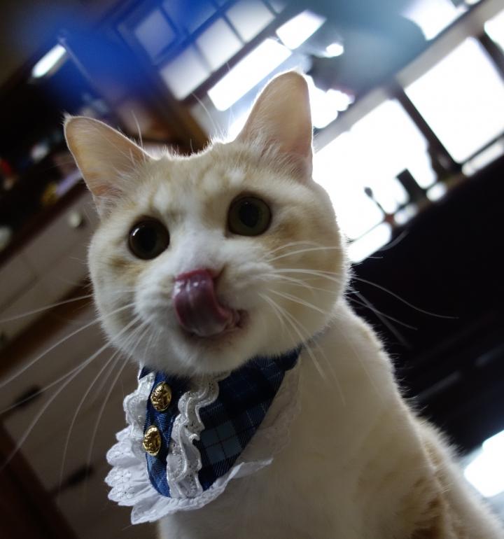 ミイは前掛けが視界に入るのか?気になってしまい自分で外してしまうんです。
