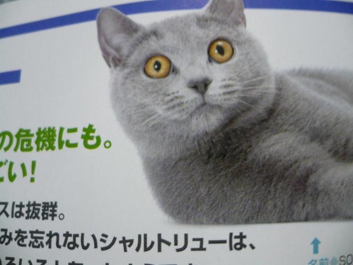 フランスのシャルトリューという品種の猫で、ロシアンブルー、コラットと並んで「ブルー御三家」と呼ばれている猫です。