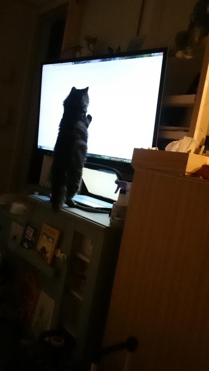 夢中で画面に猫パンチしている時に、ふいに乗っていたキャビネットからドテッと落ちるので