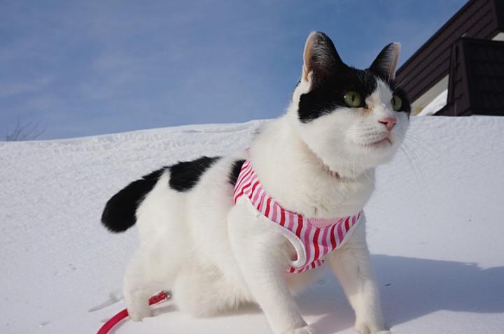 真っ白な雪と青空に、ピンクのストライプハーネスが映えるね💕😉💕