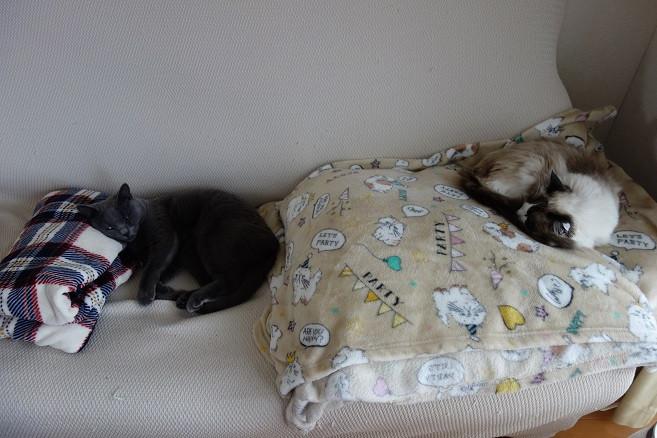 めずらしく二匹でソファーの上で朝寝です