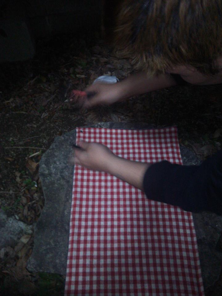 外は寒いので↑の画像の板で布に穴をあけるはずが・・・あきません!wってことで玄関先へゴーー!