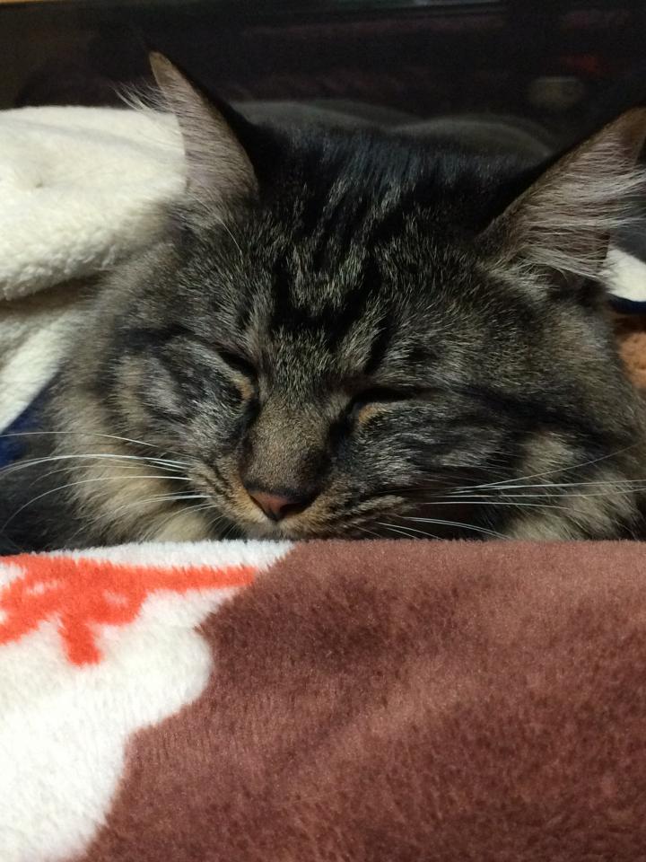 先ほど、初めての鼻チューを終えた2匹ですが、今は何事もなかったかのように、新入り・きなこは自ら隔離部屋に戻り、先住・むぎはリビングで寝ております。