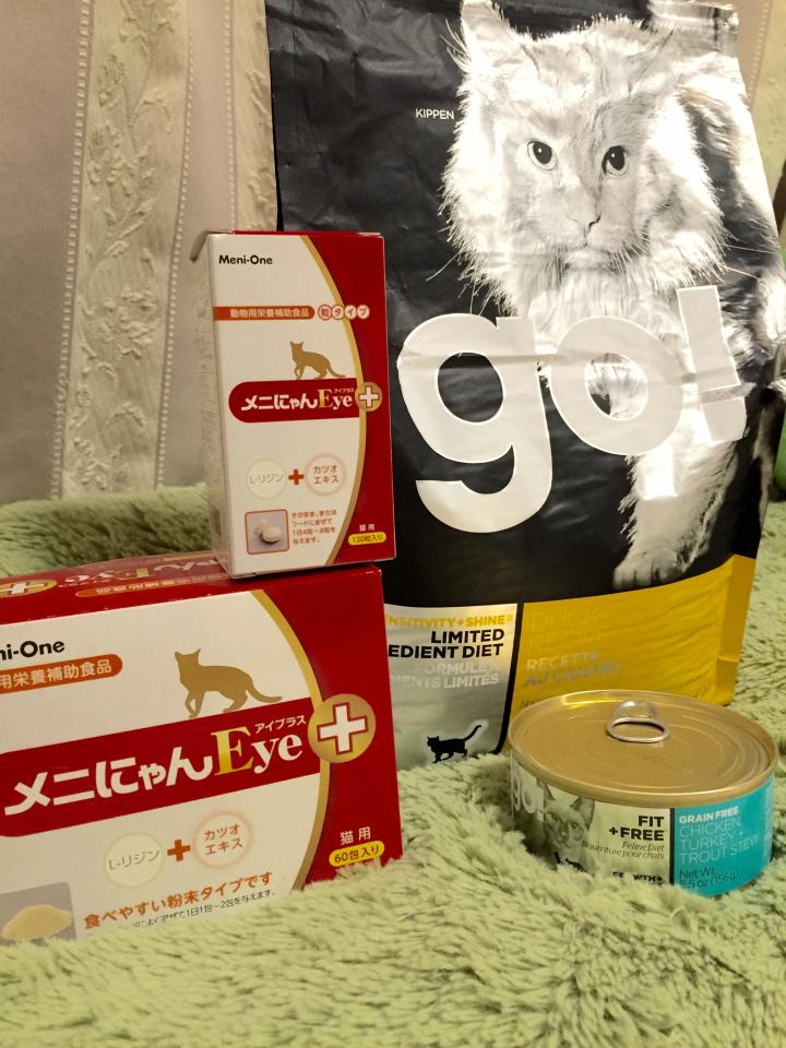 メニにゃんEye+は顆粒と錠剤の2種類を購入したので、其々をフードに与えたところ好んで食べてくれて\(^o^)/