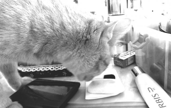 ☆外出前の身支度を妨害。天井近くまである家具からメイクボックスの蓋に飛び降ります。
