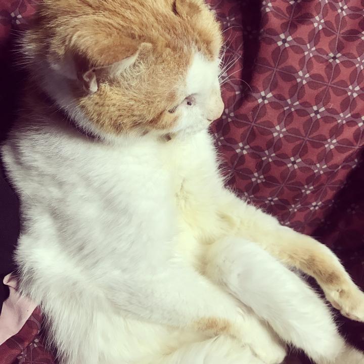 おかまいなしに膝の上でくつろぐきなこ。前足にあった傷口にも毛が生えてきて、顔も飼い猫らしくふっくらしてきました。