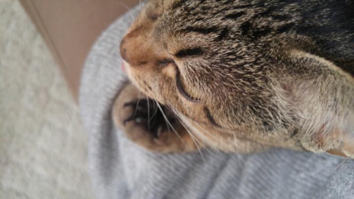 膝でまったりする、りん。