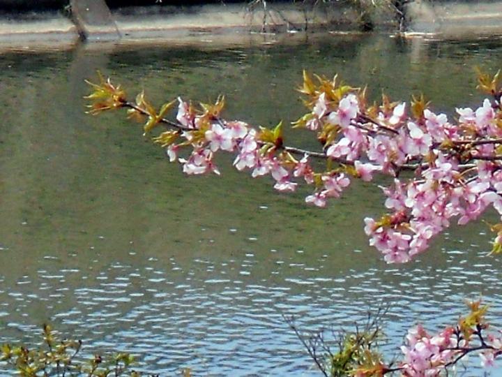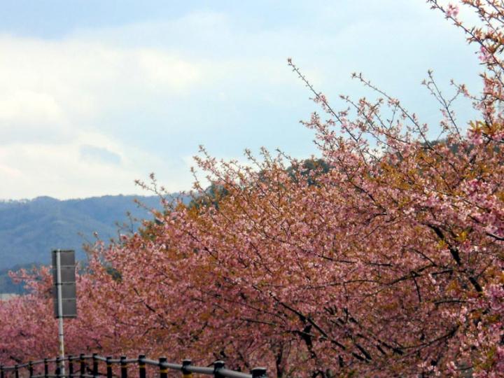 車でドライブしていると、堤防沿いにピンクの桜並木を発見!