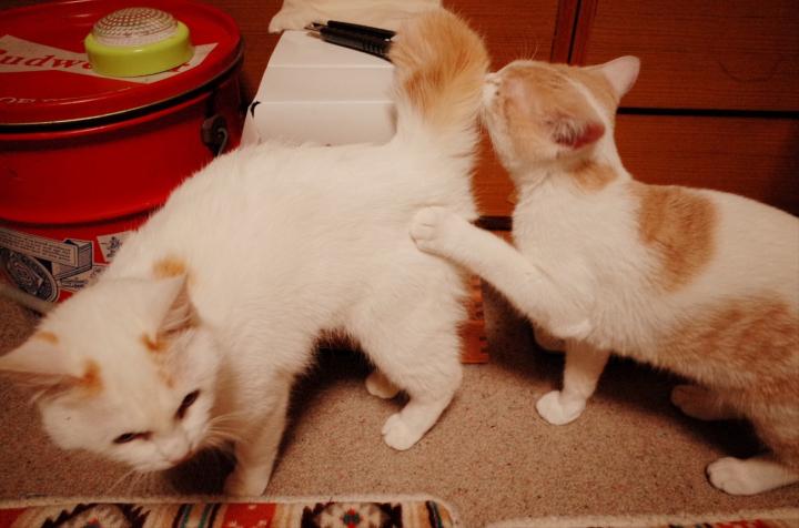 最初は肝が据わっているおもちちゃんに対し「フーーッ!」炸裂で近付けなかったゆずでしたが、1時間後には子分のように後を付いて回るようになり、次の日には構ってほしくておもちちゃんにちょっかい出しまくり(;´Д`)