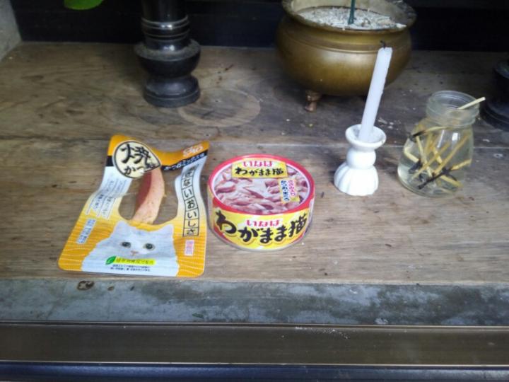 お供えは奮発して、大好きな定番の鰹節スティックと猫缶。