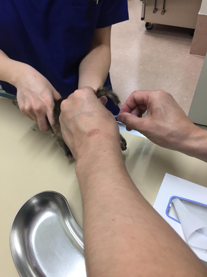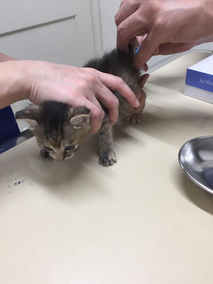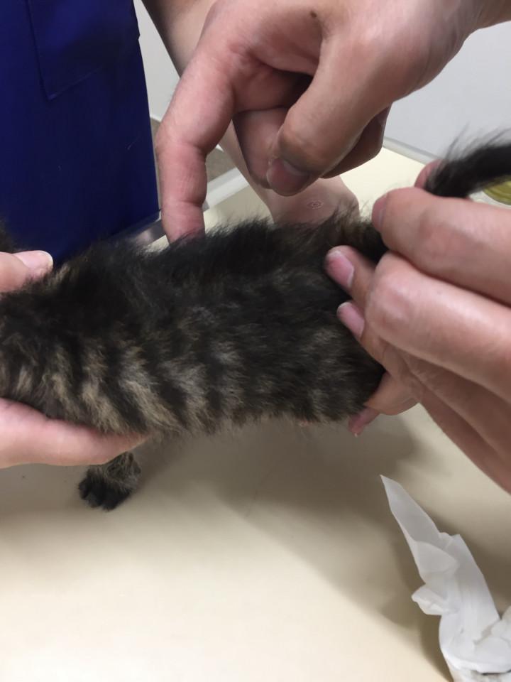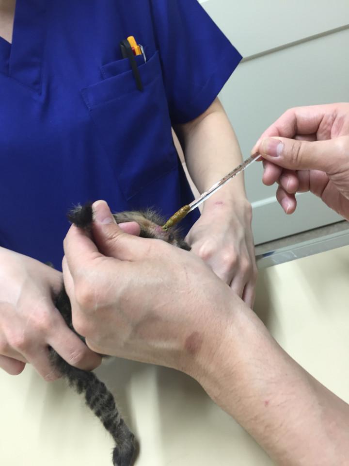 摘便が終わったら、一切鳴くのをやめ、女医さんに身を預けて、お尻をキレイにされてた、