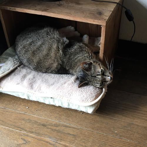 寝床は人間のベッドの奥にあるから室内に入らないと様子が分からない