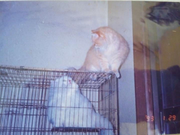真っ白い猫で「太郎」君、我が家の猫はゲージで飼っていまして気の優しい子でした。