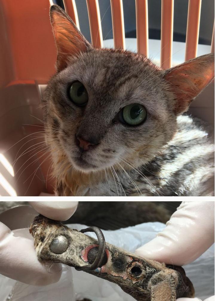なんと古い首輪に前足が引っかかり、もう首輪が見えないほど肩から前足に食い込んでいたそうです。