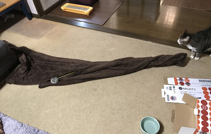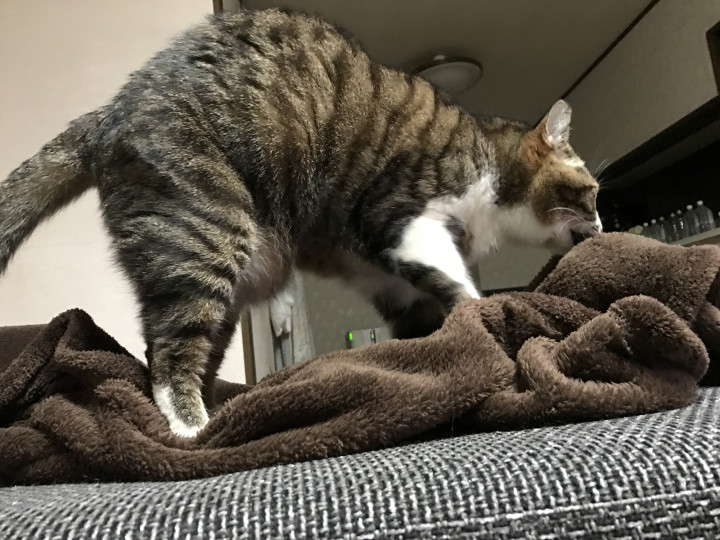 基本的に立ち上がってフミフミするスタイルで、これがひざ掛けなどの軽いものなら移動しながらちゅっちゅしております。