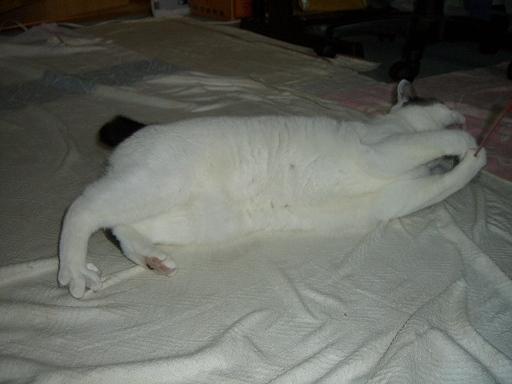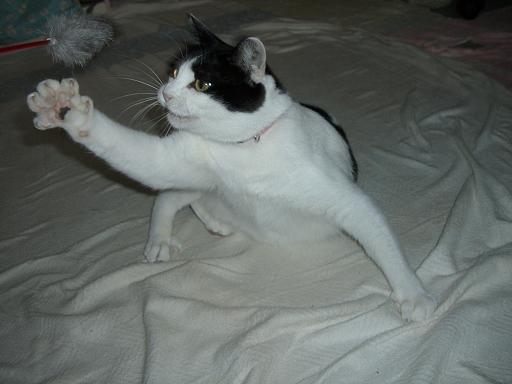 『あっ、左前足がシーツに引っ掛かった。取れにゃぃ~!でもふわふわじゃらしで遊びたいにゃん』