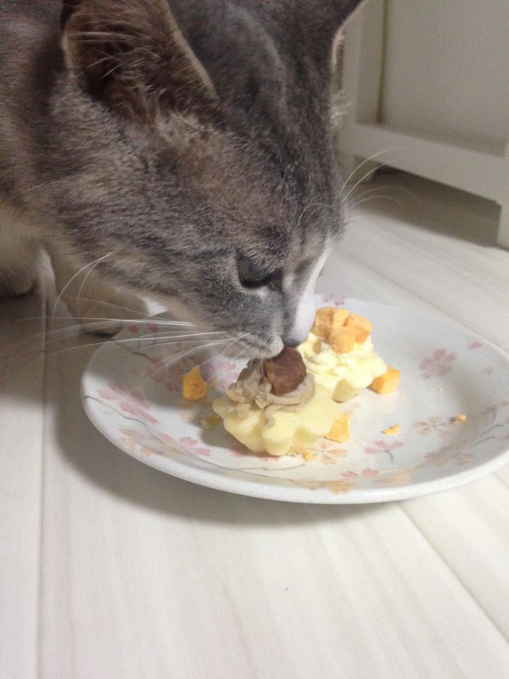 保護猫さんのさば白君が、ちょっとなめて終わったケーキでした。