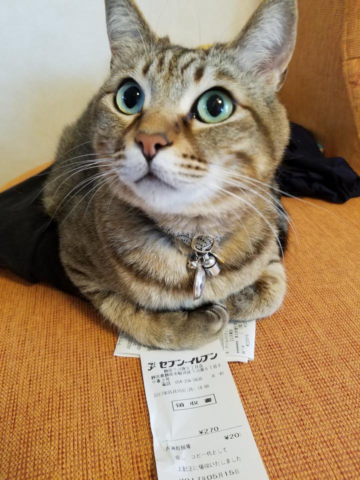 財布からレシートを出して、ちょっとソファに置いておいたら、ドラッチョがいつの間にかここに座ってたんです。