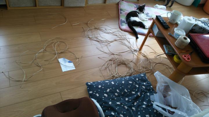 休憩時間に紙紐を広げ、朝5時半に起きちぐらを作っています。