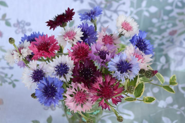 色とりどりの矢車草、家にかえってガラスの器に生けてみた。
