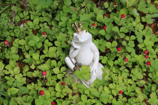 庭のカエルの周りがヘビ苺でいっぱいになった。