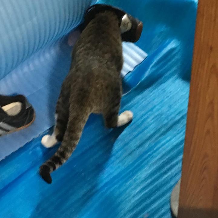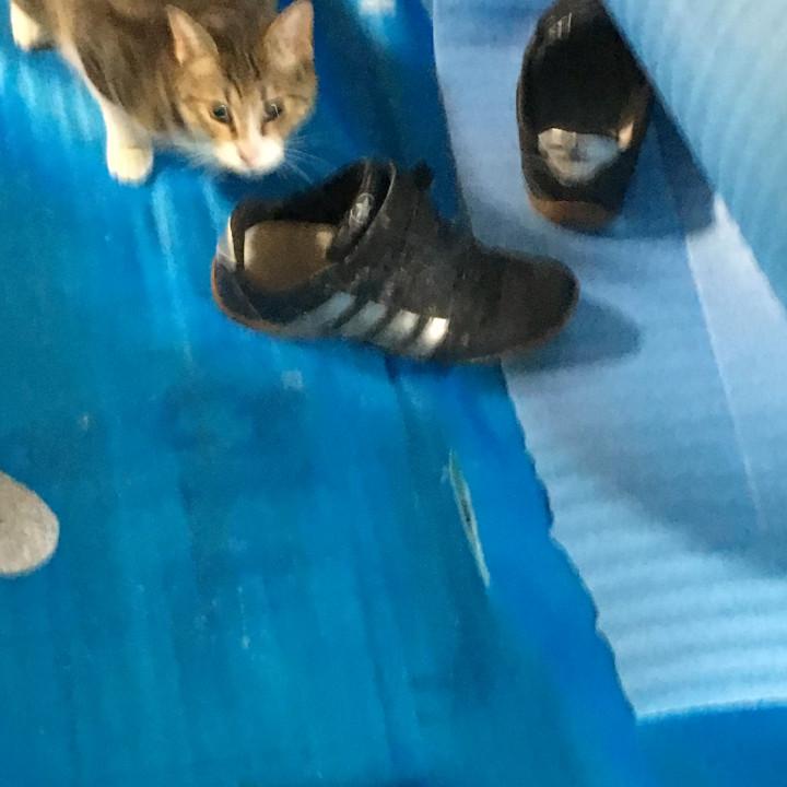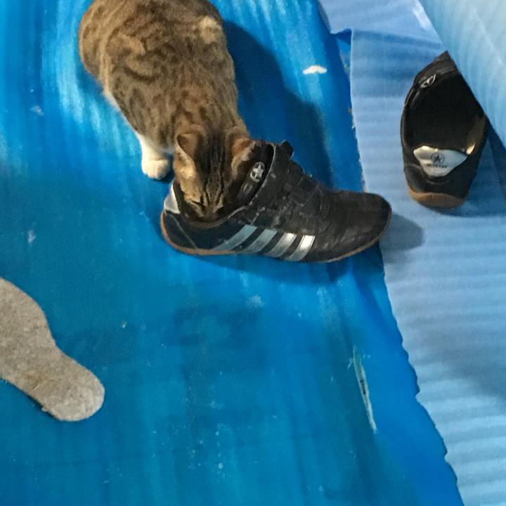 ムタ(キジシロオス11ヶ月)はリフォーム工事に来ている業者さんの靴がお気に入りで、靴の中に顔を入れてあっちこっちに移動させてます。