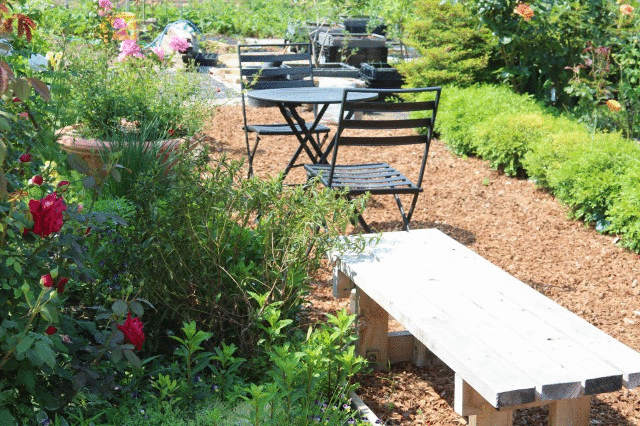 以前は庭の中央に大きなパーゴラ(つる薔薇がからまる大きな棚)があったそうですが、解体した廃材を利用しての長椅子。