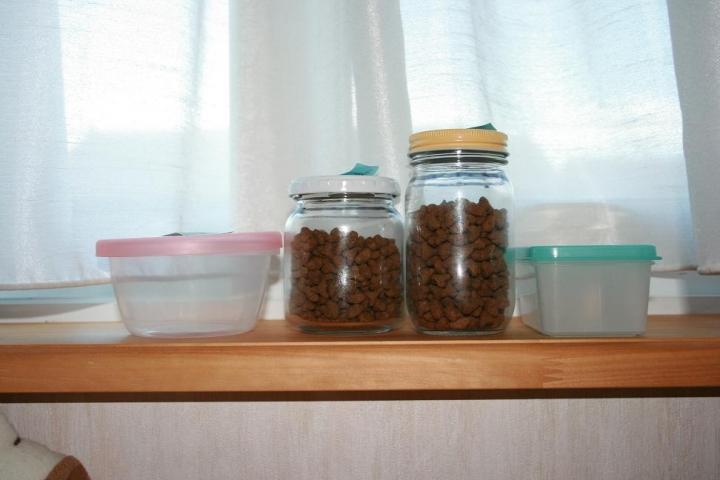 残ったら、ソレゾレ瓶の側に置いてある入れ物(写真)に入れて、保管し次回の食事時に混ぜて食べてもらってます。