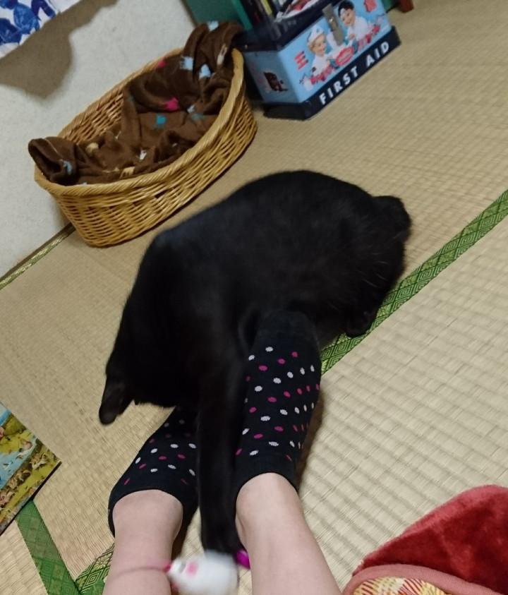 つい先日は、私が座って足を延ばした状態で、足元からおもちゃをチラッチラッ…とやってみたら足に飛びついてきました!