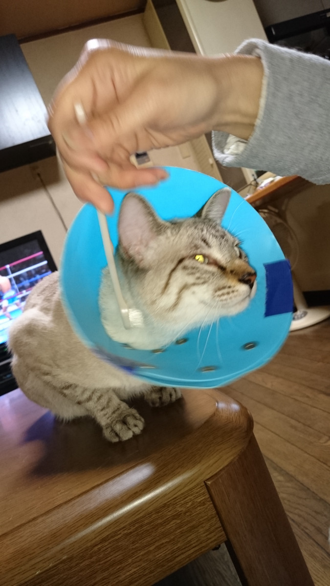 自分で持って噛みつきたいみたいだけれども カラーが邪魔で出来ず(>_<)