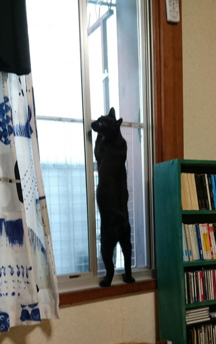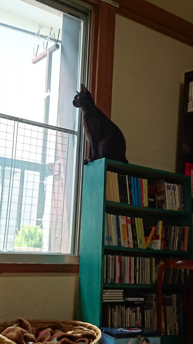 登るのに飽きると隣の本棚に登ってずーっと外眺めてます。すぐ隣の家の壁なので眺めは良くないんだけどね、ごめんよ…