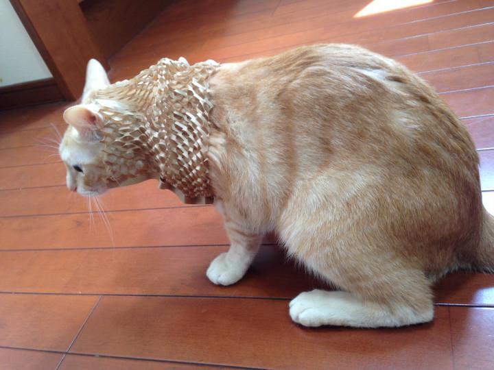 ビン物を買った時の緩衝ネットをハンちゃんに被せたら固まりました