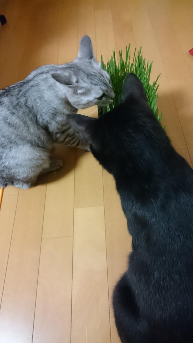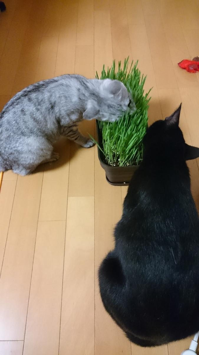 今日も今日とて、旦那さんが丹精込めて育てたネコ草を献上。