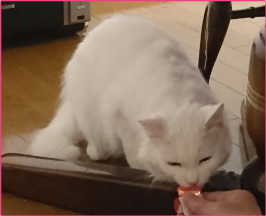 テーブル下に居る雪之丞🐱にチュールチュー●をあげてみた😊初めはビックリしたのかシャー🎵といっていたが、美味しそうな匂いに誘われ、ひと舐めふた舐め…もう夢中✨😍✨