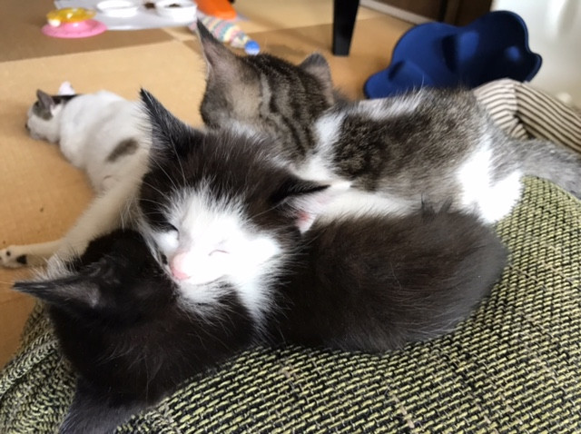 止まることを知らないのか!っていうくらい、弾丸のように走り回っている子ニャンズですが、今回の画像のように寝る間際はかわいい写真の撮り放題です♪