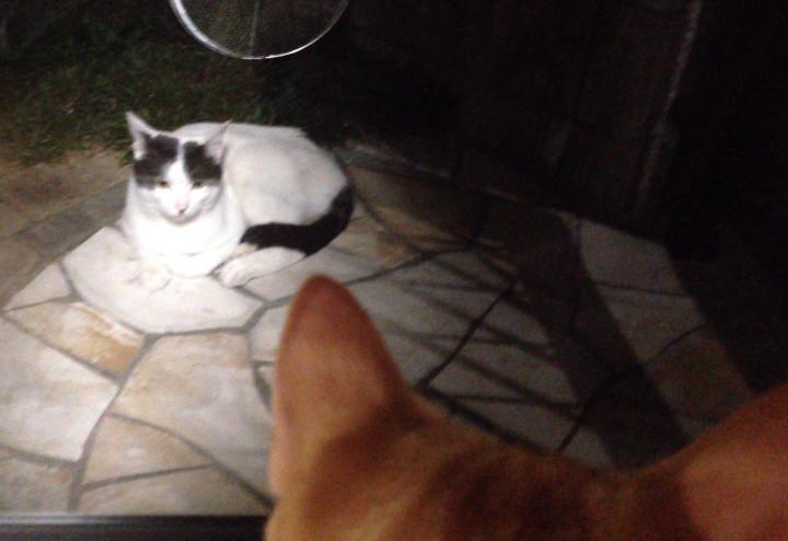 最初はお互い興奮していましたが、網戸越しに顔を近づけたりしたあと、この状態で落ち着いています。