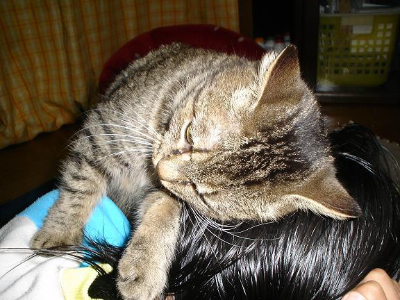 重さに耐え、ジッとしていると爪を出して娘の頭を抱えます。