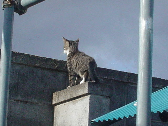 塀の支えの部分を両手でつかみ、棒のぼりをするかのようにあっという間に登ったね。