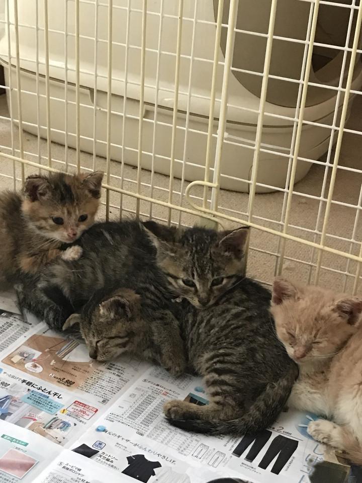 この子は最後の最後まで、なかなか捕獲できず、困っておりました。空き家の中でニャーニャーずっと鳴いていて、ほかの兄弟達はみんな捕獲されたので、たった1人でお腹もすいているのに、餌にも釣られず、ずっと鳴いているだけでした。そこで、先に捕獲した子猫を連れて行き、鳴いて(呼んで)もらったんです。先に捕獲された子猫がニャーニャー鳴くと(呼ぶと)、三毛はチョロチョロと空き家から出て来て、ガシッと捕獲できました。なんだか、胸が熱くなりました。三毛は1人で心細くて心細くて、兄弟達が迎えに来てくれたと思って、勇気を出して出て来たのでしょうね。子猫達が再会できて本当に良かったと思います。
