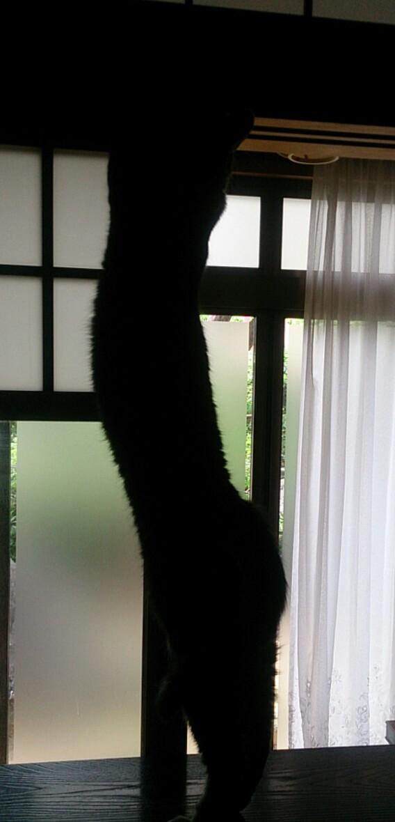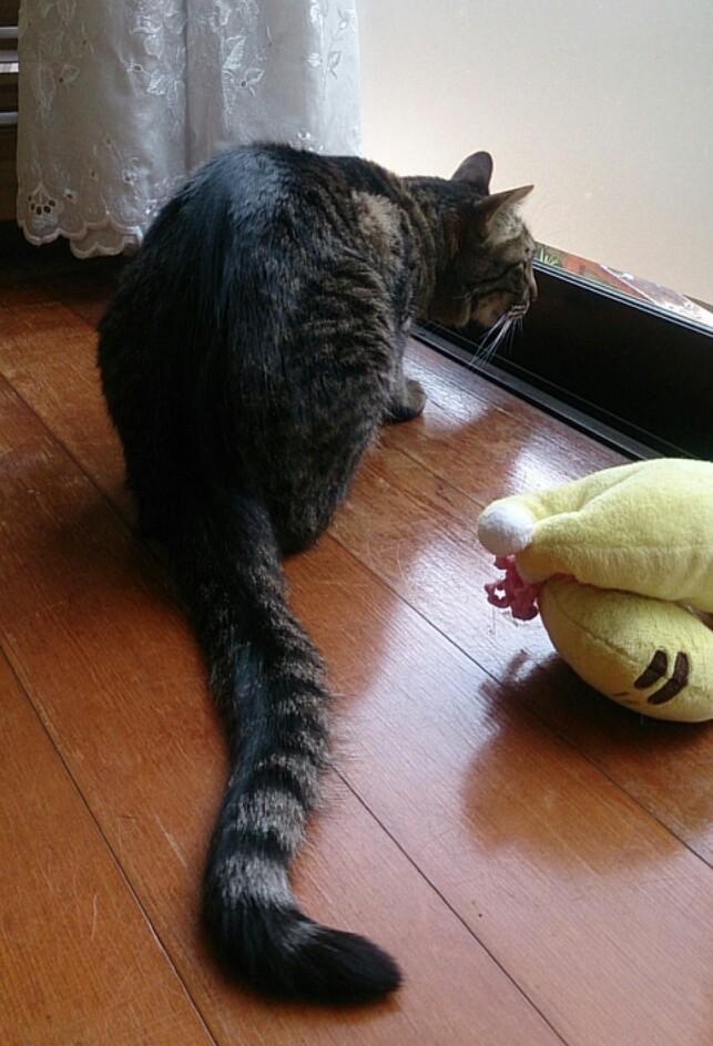 庭を歩く猫ちゃんを、うちのニャンズは偵察しています。