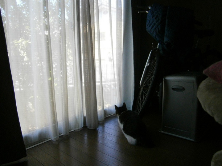外のフェンスに留まっているハトを狙うしおみちゃん^^